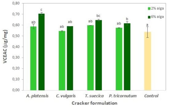 Antioxidant capacity (expressed as µg of vitamin C equivalent antioxidant capacity (VCEAC) per g) of crackers enriched with different levels of microalgae. Results are expressed as average ± standard deviation (n = 3).
