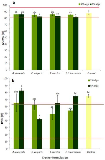 Figure 7 presents the in vitro digestibility of microalgae crackers, in terms of total dry matter (IVDMD) (Figure 7a) and protein (IVPD) (Figure 7b) digestibility. The lower and upper limits for these parameters, determined for six commercial crackers, are also represented in Figure 7.