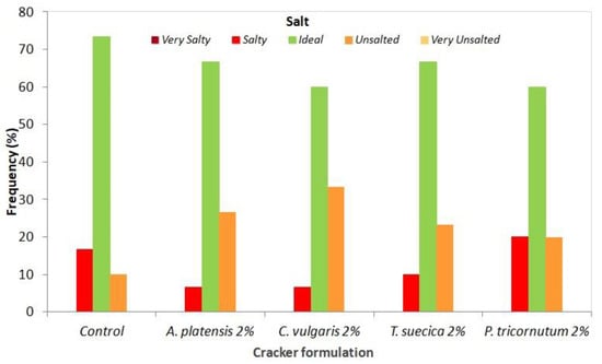 Interestingly, the addition of microalgae seems to affect the perception of saltiness, with a higher frequency of “unsalted” classification ascribed to algae crackers (20–33%) in relation to the control (10%) (Figure 9).