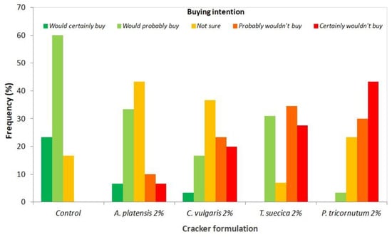 Responses of the sensory analysis panel tasters (n = 30) in terms of buying intention for crackers enriched with 2% microalgal biomass, as well as the control sample.