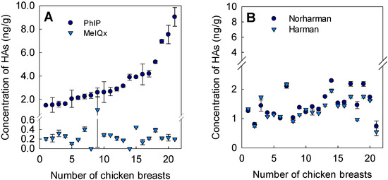 Concentrations of heterocyclic amines (Has) in 21 different grilled chicken breasts sorted in ascending order of the PhIP levels. (A) Concentration of PhIP and MeIQx; (B) Concentrations of β-carbolines norharman and harman.