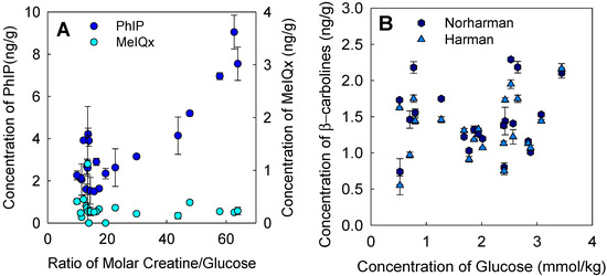 The only significant linear correlation existed between PhIP and the molar ratio of creatine/glucose (r = 0.88, p < 0.001) (Figure 2A), with increasing glucose contents generally reducing the detectable concentrations of PhIP (PhIP vs. glucose, r = 0.69, p < 0.001). This result agrees with a previously performed study that focused on different levels of glucose in ground patties of various animal species (r = 0.87, p < 0.001) [13]. In contrast to this study, the concentration of MeIQx reported here did not significantly correlate with the ratio of creatine/glucose (r = 0.18, p > 0.05). Moreover, the formation of β-carbolines did not significantly correlate with the glucose concentration. In contrast to PhIP- and MeIQx-formation, the formation of the harman and norharman (β-carbolines) does not need creatine as a precursor [3,28]. β-Carbolines are neither mutagenic nor carcinogenic; however, they may enhance the mutagenic activity of other HAs or other aromatic amines and are therefore considered co-mutagenic [34]. Furthermore, they can be formed at lower temperatures and have been already detected in cooked meat, fish, and meat extract [35].