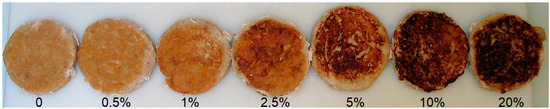 Image of emulsion-coated and grilled chicken patties using different glucose concentrations (0%, 0.5%, 1%, 2.5%, 5%, 10%, and 20%, w/w emulsions).