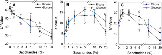 In Figure 3 and Figure 4, the color change of the grilled chicken breasts containing increasing glucose and ribose concentrations is presented. The color of the crust changed from a more pleasant reddish-brown to a black surface with increasing concentrations of saccharides. In particular, the L*-value changed significantly with increasing concentrations of ribose and glucose (p < 0.05) to lower L*-values (Figure 4A).