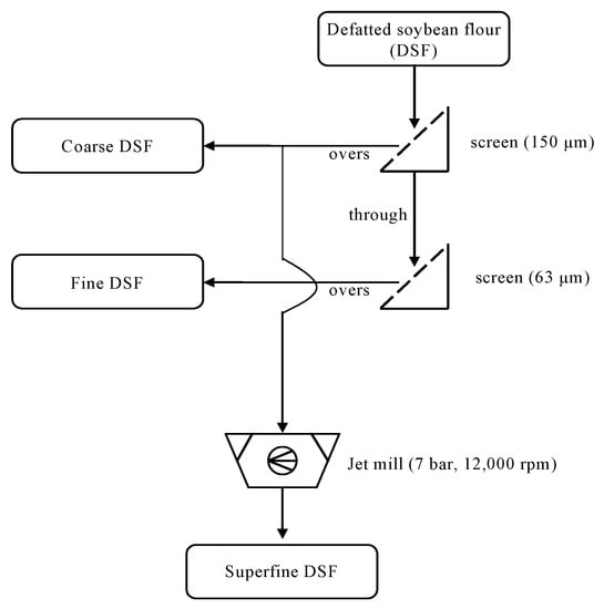 The process flow for the preparations of coarse, fine, and superfine defatted soybean flour (DSF) using serial screening and jet milling.