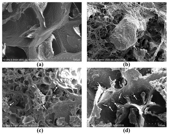 Scanning electron micrographs of tofu made with different fibers at 500× magnification: (a) tofu made without DSF, (b) tofu made with coarse DSF, (c) tofu made with fine DSF, and (d) tofu made with superfine DSF. The arrows represent DSFs.