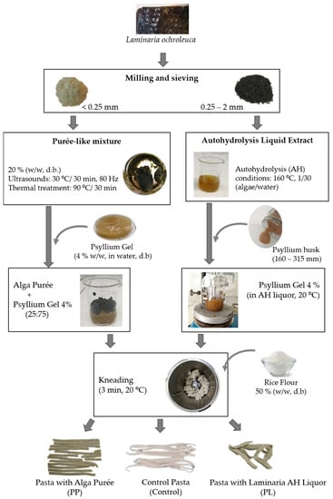 Focusing the full valorisation of L. ochroleuca, two samples were prepared for pasta incorporation: (1) autohydrolysis (AH) liquid extract obtained according to the procedure described in Fradinho et al. [19]; (2) purée-like mixture (20% (w/w) alga, ultrasound 30 min, 90 °C/30 min prepared following the procedure already described by Fradinho et al. [19] (Figure 1).