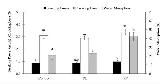Cooking quality parameters of pasta prepared with Laminaria ochroleuca liquid extract (PL), alga purée (PP), and control (without alga). Data are presented as mean ± standard deviation (s.d.). Different letters in the same parameter correspond to significant differences (p < 0.05, one-way ANOVA, post-hoc Tukey test).