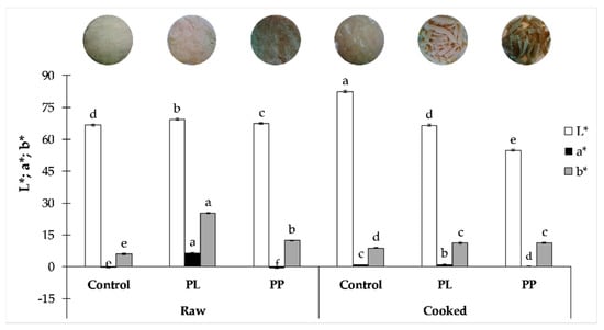 Colour parameters (L*, a*, b*) of raw and cooked pastas. Different letters in the same parameter (e.g., L* raw and cooked) correspond to significant differences (p < 0.05, one-way ANOVA, post-hoc Tukey test).