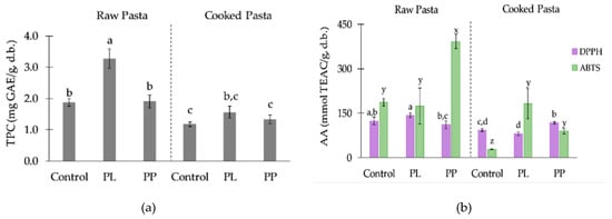 The total phenolic content (TPC) and in vitro antioxidant activity (AA) of pastas was performed by DPPH and ABTS methods (Figure 4). Moreover, considering that these foods are consumed after thermal processing, and that cooking induces great changes in texture, molecule structure, content and availability [23], determinations were repeated also on cooked samples.