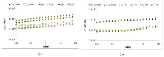 Mechanical spectra of raw (a) and cooked (b) gluten-free (GF) pastas: with L. ochroleuca liquid extract (PL), alga purée (PP), and control (without alga). Closed symbols—storage modulus, G’; open symbols—loss modulus, G”.