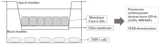 A co-culture system of Caco-2 and THP-1 cells was used with modifications (Figure 1) [27]. In brief, Caco-2 cells were maintained in DMEM at 37 °C under humidified 5% CO2 and seeded in the upper chamber of a Transwell filter (Corning CoStar Corp., Cambridge, MA, USA) for 3 weeks (48–60 passages) until transepithelial electrical resistance (TEER) was observed. The upper-chamber Caco-2 cells were then placed in the lower chamber of the Transwell filter preloaded with THP-1 cells and incubated for 24 h. The upper layer was Caco-2 cells that had been cultured to form a monolayer cell membrane, and the lower layer was THP-1 cells, which were stimulated with 10 ng of lipopolysaccharides (LPS) per mL and 10 ng tumor necrosis factor α (TNF-α) per mL for 24 h. The lower cell culture medium was collected for experiments. An amount of 500 ng/mL LPS was used to verify the feasibility of the Caco-2 and THP-1 co-culture system for 3 h. Fluorescein isothiocyanate- dextran tracer (FD-4) (4 kDa, MW4400) was used as the positive control for calculating the penetration rate, and the TEER value before and after the test was detected.