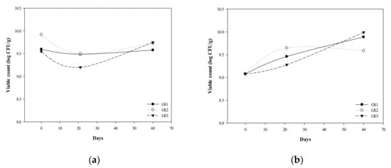 We used extracts of G. coronopifolia as a red seaweed prebiotic, mixed with five probiotics of Lactobacilli and Bifidobacteria, and supplemented with 15% skim milk powder as a protective agent, with the probiotics and prebiotics blending ratio of GS1 (30:70), GS2 (50:50), and GS3 (70:30). The number of bacteria of probiotic products containing live bacteria needs to be ≥106 cfu/g to exert their activity; thus 106 cfu/g is used as a screening condition for storage [31]. The storage stability test of the prepared G. coronopifolia synbiotics (GS1, GS2, and GS3) was performed at different temperatures (4 °C and −20 °C). With storage temperature 4 °C for G. coronopifolia synbiotics for 60 days, the number of bacteria remained at 109 cfu/g (Figure 2a); after storage at −20 °C for 60 days, the number of bacteria was still maintained at 106–108 cfu/g for GS3 and GS1 synbiotics (Figure 2b). Thus, low temperature effectively delayed the reduction in number of bacteria in the G. coronopifolia synbiotics but retained the stability of the cryopreservation. The intestinal chronic diseases, such as the inflammatory bowel disease, colon cancer, and contentious bowel syndrome, are highly related to the microbial community of the intestinal tract and balanced activities [32]. Thus, the product stability needs to be maintained to ensure the superiority and quality of the G. coronopifolia synbiotics.