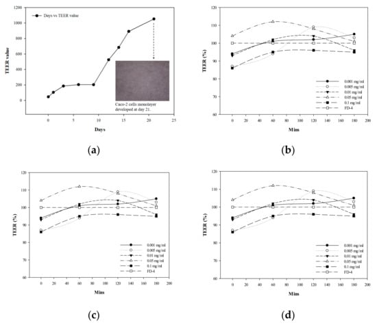 In this study, Caco-2 cells were used for evaluation, and the degree of change in trans-epithelial/endothelial electrical resistance (TEER) was measured. The value should be ≥600 Ω·cm2 to authorize the formation of a monolayer film. However, the TEER value for cultured Caco-2 cells until day 14 was 685 Ω·cm2 (Figure 3a); the required incubation time for forming a completed monolayer was observed by microscopy as day 21, 1053 Ω·cm2.