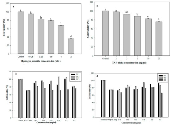 Cell viability (%) of THP-1 cells after induction by different doses of (a) H2O2; (b) TNF-α; treatment with G. coronopifolia synbiotics and induced by (c) H2O2 and (d) TNF-α. Means with the same letters in a column do not differ significantly (p < 0.05) (n = 3).