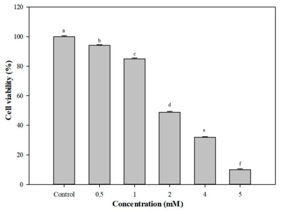 Cell viability of Caco-2 cells after induction with different concentrations of H2O2. Means with the same letters in a column do not differ significantly (p < 0.05) (n = 3).