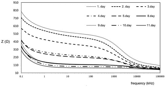 |Z| showed clear visual differences among the groups at all the frequencies below 1 MHz (Figure 2). Nine groups (i.e., days of storage) were clustered into a maximum of six subsets per frequency (Table 1). The impedance magnitude |Z| seems to change more evidently during the first day at T = 4.5 °C. From day 8 until day 11, |Z| was constant, as evaluated at frequencies from 0.05 to 0.10 MHz.