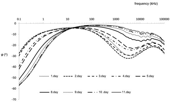 Phase (φ) of European squid samples during chilled storage (4.5 °C, RH 55%) in the entire frequency range.