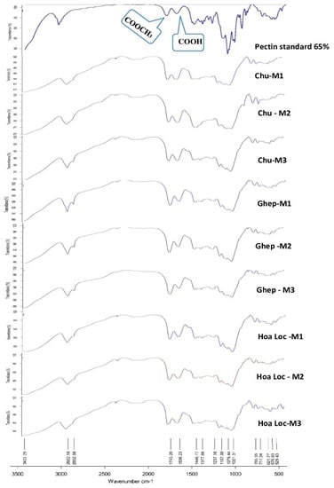 Fourier-transform infrared spectroscopy (FTIR) spectra of mango peel pectin collected from the three mango varieties at different maturity stages. Chu-M1: the immature Chu mango; Chu-M2: the mature Chu mango; Chu-M2: the overripe Chu mango; Ghep-M1: the immature Ghep mango; Ghep-M2: the mature Ghep mango; Ghep-M2: the overripe Ghep mango.