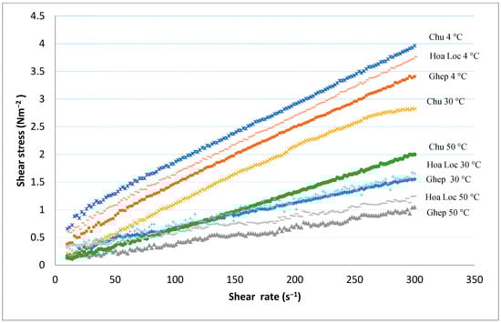Rheological analysis of the pectin solutions was performed in a HAAKE viscometer and rheometer RheoStress 6000 (Thermo Scientific, Waltham, MA, USA). Thermo Scientific HAAKE RheoWin software (Thermo Scientific, USA) was run to record shear stress (τ) and shear rate (γ) values. Pectin (10 g L−1) were dissolved in 0.1 mol L−1 sodium chlorine solutions (Merck Sharp & Dohme Corp., Kenilworth, NJ, USA) and left for 12 h at room temperature prior to measuring []. The flow curves were obtained at different processing temperatures 4 °C, 30 °C and 50 °C. The shear rates from 10.0 to 300 s−1 were chosen.