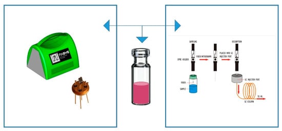 The research works were carried out following three steps. Firstly, the volatile organic compound (VOC) determination of fruit jams was carried out with GC–MS and SPME analysis (for details, see Section 2.2). Secondly, a small sensor system (S3) nanowire gas sensor device was developed and optimized (details see Section 2.3) in our lab with collaboration with the NANO SENSOR SYSTEMS Srl spin-off of the University of Brescia, Italy. The measures used in parallel, in this study, are shown in Figure 1.