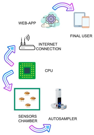 S3 is an acronym for small sensor systems, which is a device developed by the collaboration of the groups involved in this study. S3 was previously used, with considerable success, in numerous studies applied to the field of food technology and quality control [,]. S3 consists of an electronic part to manage the signal, in order to send acquired data to the cloud, where it is possible to store and analyze them; an element that allows its connection to the internet; a pump to bring the volatile compounds to the heart of the instrument, as shown in Figure 2.