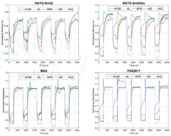 Signals obtained from four sensors: RGTO SnO2 (upper left side), RGTO SnO2Au (upper right side), MQ3 (low left side), and TGS2611 (low right side). Five measures are shown as an example of the typical sensor responses to apricot.