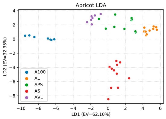 First two LD (linear discriminant) components for discrimination between the recipes of apricot jam (explained variance (EV) = 94.45%); LDA: linear discriminant analysis; A100, AL, APS, AS, AVL: sample code.
