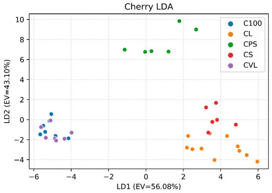 Figure 5 shows the same typology of graph for cherry samples (EV = 99.18%). Unlike what is shown in Figure 4, C100 and CVL clusters overlap; in this case, the array seems to not be able to recognize that those samples come from different recipes. The CL and CS groups are very close on the graph. For cherry samples, the relative abundance of common compounds is 4.12% for CPS, 43.79% and 53.32% for C100 and CVL respectively, and 80% and 85.28% for CL and CS, respectively. These values reflect how the different recipes cluster in the LDA graph, and the relative abundance of common compounds can explain this result in this case. Furthermore, CPS is the only recipe that contains D-limonene—the abundance of which is 43 times higher than the second most abundant compound of the recipe in terms of the area of the peak and has lower quantities of furfural (0.59%) and benzaldehyde (1.07%). Indeed, the C100 and CVL recipes have an amount of furfural equal to 16.2% and 28% and of benzaldehyde equal to 5.47% and 11.7% respectively. However, for the CL and CS samples, benzaldehyde (58.65% and 59.5%) is much more present than furfural (18.24% and 8.42%). In this case, LDA achieves a classification rate equal to 83.78%. This result is lower than the previous due to the overlap of C100 and CVL clusters and to the fact that CL and CS are not 100% linearly separable.
