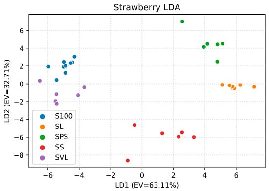 Finally, in Figure 6, the LDAs for strawberry specimens are presented in the same way as for the previous fruits (EV = 95.82%). S100 and SVL are the closest groups—a result that can be compared to the one obtained with cherry. On the contrary, there is better distinction between SS and SL in respect to CS and CL. In addition to the apricot samples, strawberry specimens show similar values of the abundance of common VOCs; these percentages range from 54.12% to 75.01%. However, there are some differences if the most abundant compounds for each recipe are compared. The distance of the SS cluster from the others can be explained by the presence of acetone (relative abundance of 10.38%, which is absent in the remaining recipes), ethyl acetate (4.58%; it is present only in SL for a quantity equal to 2.48%) and benzoic acid (3.83%, in comparison to 0.35%–0.80% in the other samples) among the most abundant compounds. S100 and SVL have almost the same most abundant compounds (furfural, benzaldehyde, α-terpineol, 1,6-octadien-3-ol, 3,7-dimethyl-, ammonium acetate and pentanal), except for the presence of cyclobutane, 1,2-bis(1-methylethenyl)-, trans- (10.87% of relative abundance) and dimethyl sulfide (6,20%) in S100 and nerolidyl acetate (12.46%) in SVL. The same common VOCs can be found in SPS and SL (sample code); in this case, sensors recognition of the recipe could be addressed to 2-Heptenal, (Z)- (SPS: 3,6%; SL: not present), Acetophenone (SPS: 3,39%; SL: 1.49%), Butanoic acid, 2-methyl- (SPS: 1,52%; SL: 2.67%) and Ethanone, 1-(2-furanyl)- (SPS: 1.53%; SL: 2.48%). Nevertheless, LDA accuracy is higher among the three recipes and it is equal to 97.06%.