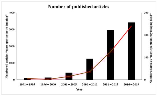 Publication trend (number of published articles) related to mass spectrometry imaging (black bars) and mass spectrometry imaging of food (red line).