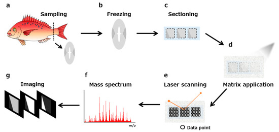 Scheme of matrix-assisted laser desorption/ionization mass spectrometry matrix-assisted laser desorption/ionization mass spectrometry (MALDI-MS) imaging. (a) Tissue sampling. (b) Preparation of a fresh-frozen sample. (c) Sectioning. (d) Application of the matrix. (e) Laser scanning. (f) Procurement of the mass spectrum. (g) Visualization of the ion distribution of molecules.