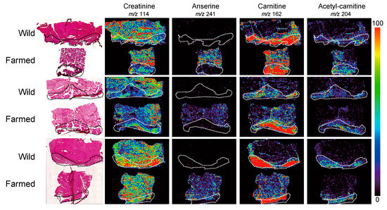 MALDI-MS imaging has also been applied in the field of aquaculture. Sroyraya et al. [35] visualized the metabolites of the eyestalk of the blue swimming club, and Piyachat et al. [13] showed the distribution of neuropeptides in shrimp. We also analyzed the metabolic molecules of wild and farmed red sea bream to identify species-specific metabolic differences. Because the complete genome sequence of red sea bream is not yet complete, it has been very difficult to find molecular markers of wild and farmed fish for their respective identification. However, using MALDI-MS imaging, we were able to discover some lipid molecules that differed between wild and farmed fish. Furthermore, the specific distribution of anserine, a well-known nutrition factor, in farmed red sea bream could be detected (Figure 3) [46].