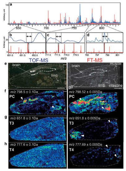 Time-of-flight (TOF) technology is widely used for MS imaging, as this can effectively separate ionized accelerated molecules according to their mass-to-charge ratio (m/z). However, the mass resolution of TOF-MS is still not sufficient for a wide detection range since the single image is reconstructed at a resolution of ±0.1–0.2 Da, which might result in the overlap of multiple molecules within one constructed image. However, recent technological developments succeeded in achieving a higher mass resolution of approximately ±0.01 Da using Fourier-transform ion cyclotron resonance (FT-ICR) MS. For example, TOF-MS could not reveal the characteristic localization of thyroxine hormone (T3) in amphibian larvae owing to multiple mixed molecules including phospholipids in the vicinity of the molecular weight of the target. However, when the same sample was analyzed with FT-ICR MS, T3 and T4-specific peaks were observed (Figure 4) [77].
