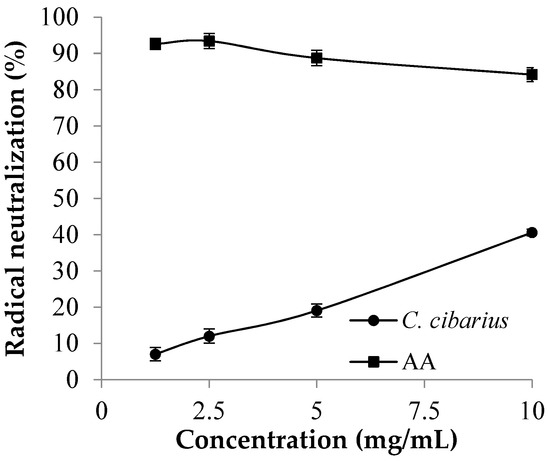 It was found that the decoct of C. cibarius exhibits neutralization of the ABTS radical in a dose-dependent manner (Figure 1). However, 50% of the radical neutralization had not been reached in the range of tested concentrations. Moreover, mushroom decoction was a weaker radical scavenger in comparison with ascorbic acid. Other authors found C. cibarius as a very potent source of antioxidative compounds, like polyphenols, ascorbic acid, and β-carotene [20,21]. The ability of the C. cibarius ethanol extract to scavenge ABTS radicals was tested by Dimitrijevic et al. [20], who reported an EC50 of about 14 mg/mL. In our study, the EC50 was a bit lower, around 12 mg/mL.
