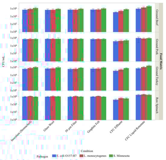 | Condition | Food Matrix | Pathogen | % Retentate | % Effluent | % Unaccounted |