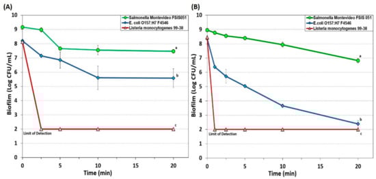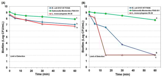 Biofilm microplate assay of E. coli F4546, S. Montevideo FSIS 051, and L. monocytogenes 99-38 against 7-day biofilms challenged with 10-Chlor sanitizer for 0–60 min at either 200 ppm (A) or 1000 ppm (B). Data points represent the means of triplicate replications and error bars represent the standard deviations from the mean (some error bars may be hidden by the large symbols). Treatments with different letters are significantly different (repeated measures (RM)-ANOVA, p < 0.05); treatments with the same letters are not significantly different (RM-ANOVA, p > 0.05).