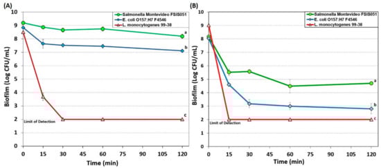 Biofilm microplate lethality assay of E. coli F4546, S. Montevideo FSIS 051, and L. monocytogenes 99-38 on 7-day extended biofilms challenged with Bi-Quat sanitizer for 0–120 min at 200 ppm (A) and 1000 ppm (B). Data points represent the means of triplicate replications and error bars represent the standard deviations from the mean (some error bars may be hidden by the large symbols). Treatments with different letters are significantly different (RM-ANOVA, p < 0.05); treatments with the same letters are not significantly different (RM-ANOVA, p > 0.05).