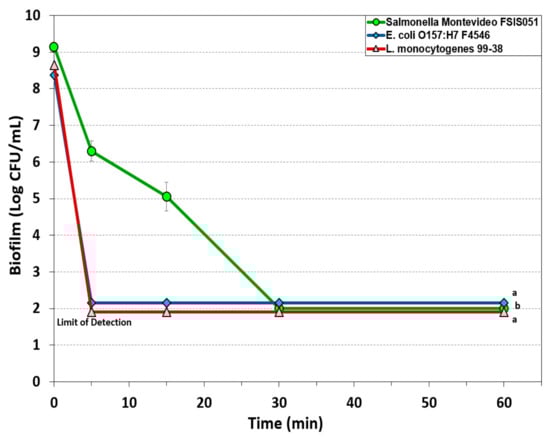 Biofilm microplate lethality assay of extended biofilms of E. coli F4546, S. Montevideo FSIS 051, and L. monocytogenes 99-38 on 7-day biofilms challenged with 500 ppm KC-610 PAA sanitizer for up to 60 min. Data points represent the means of triplicate replications and error bars represent the standard deviations from the mean (some error bars may be hidden by the large symbols). Treatments with different letters are significantly different (RM-ANOVA, p < 0.05); treatments with the same letters are not significantly different (RM-ANOVA, p > 0.05).