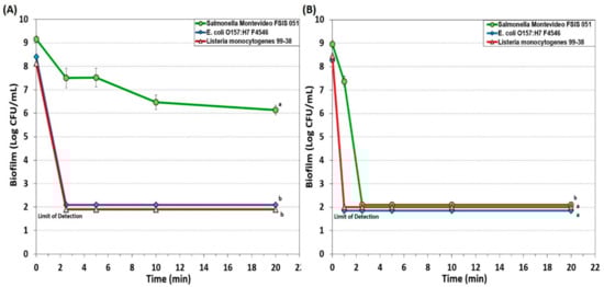 Each trial was performed in triplicate replication and all replications were performed as autonomous and separate experiments using separately inoculated cultures and prepared plating media. All data were presented as the mean of triplicate replications and standard deviation of the mean is represented by error bars. Statistical analysis of timed-series plots was done by repeated measures one way analysis of variance (RM-ANOVA) using the Holm–Sidak test for pairwise multiple comparisons to determine significant differences of sanitizer treatment on biofilms over time. Data treatments with different letters are significantly different (p < 0.05); treatments with the same letter are not significantly different (p > 0.05).