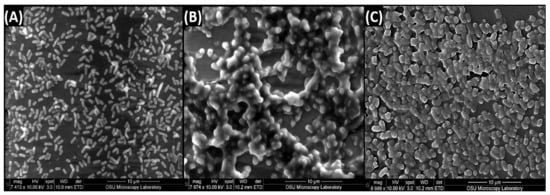 Biofilms of the three pathogens used in this study were examined by scanning electron microscopy (SEM) by inoculating ~4 log CFU/mL in BHI broth (250 µL) into wells of Millicell EZ Slide 8-well glass slides (Millipore Sigma, Sheboygan Falls, WI, USA), sealed with parafilm to avoid evaporation, and incubated at 30 °C; the media (BHI) and planktonic cells in the wells were manually removed, washed, and replenished each day, as described earlier for microplates, in order to achieve 7 day extended biofilms in the wells. A standard protocol provided by Oklahoma State University’s Electron Microscopy lab was used to fix, dry, and coat the samples before imaging. Cells were fixed for 2 h in 2.0% glutaraldehyde in 0.1 M cacodylate buffer (21.4 g sodium cacodylate brought to 500 mL with deionized H2O). The slides were then rinsed 3× in buffered wash (60 mL of 0.2 M cacodylate buffer, 140 mL of dH2O, and 12.3 g of sucrose; 15 min/rinse). Adherent cells were again fixed for 1 h in 1% aqueous osmium tetroxide (OsO4) at room temperature and then rinsed 3× in buffered wash solution (15 min/rinse). This was followed by dehydration in ethanol of different concentrations: 50%, 70%, 90%, 95%, and 100% (3×, 15 min/step), and then the slide(s) were subjected to critical point drying (CPD) or washed 2× for 5 min with HMDS (Hexamethyldisilazane). Silver paint or double-sticky tape was used to mount on stubs, which were then coated with gold–palladium (Au–Pd) and either visualized or stored in a dust-free dry area (desiccator) to view later. Visualization of the biofilms was done using an FEI Quanta 600 FEG scanning electron microscope (SEM) at the Oklahoma State University Electron Microscopy Core Facility.