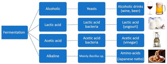 Schematic representation of the common types of fermentation, the microorganisms involved, and the end food products [79]. Alkaline-fermented foods constitute a group of less-known food products that are widely consumed in Southeast Asia and African countries. In alkaline-fermented foods, the protein of the raw materials is broken down into amino acids and peptides; ammonia is released during the fermentation, raising the pH of the final products and giving the food a strong ammoniacal smell. They can be made from different raw ingredients. For instance, Japanese natto is inoculated with a pure culture of Bacillus subtilis var natto [80].