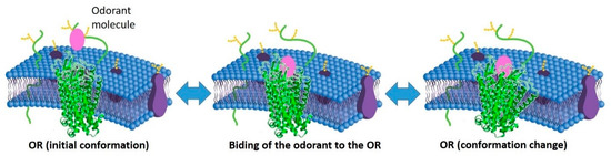 The peripheral olfactory system was described in 1891 by Santiago Cajal and continues to elude our understanding. In this context, the publication entitled “The molecular logic of smell”, from Richard Axel, in 1995 [95] was significant. It summarises intensively the research that was done in the late 80s and early 90s, which aimed to study the molecular processes of olfactory translation that occurs in the nose´s olfactory epithelium. The olfaction consists of capturing a great amount of diverse molecular aromas of the natural world, extracting information through the personal perceptions that are related to beverages, flowers, perfumes, and whatever humans encounter, within a daily basis [96]. According to the same authors, olfaction “(…) is a chemosensory processing system that can detect potentially infinite numbers of low molecular-mass compounds, called odorants, which combine at different concentrations, to elicit this complex perception (…)” [96]. Thus, the olfactory perception results of the reversible interaction of ORs with the odorant molecules (OM) (Figure 2).