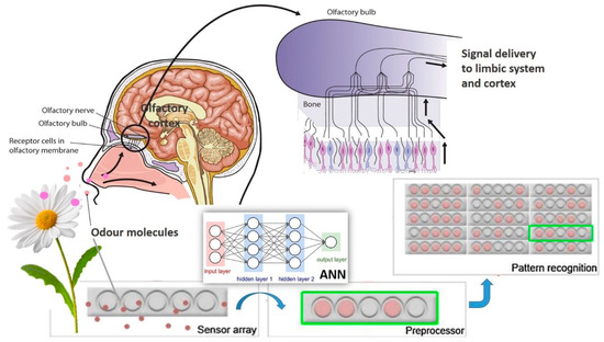 Schematic representation of an e-nose device, with the analogy to human nose. The electronic nose is an array of chemical sensors, connected to a pattern-recognition system that responds to odours passing over it. Different odours cause different responses that provide a signal pattern characteristic of a particular aroma. The computer evaluates the signal pattern and can compare the aromas of different samples, using pattern recognition. Artificial neural network (ANN).