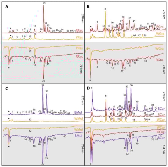 Sample high-performance diode array detector (HPLC-DAD) chromatograms of water extracts from (A) yellow (YRas) and red (RRas) raspberries; (B) white (WGra) and red (RGra) grapes; (C) white (WMul) and black (BMul) mulberries; (D) white (WCur), red (RCur), and black (BCur) currants. Chromatograms traced at 270 nm (white background) are combined with profiles of antioxidants detected online with ABTS (2,2-azinobis-(ethyl-2,3-dihydrobenzothiazoline-6-sulphonic acid) diammonium salt) radical monitored at 734 nm (grey background). The numbers of peaks correspond to analytes listed in Table 1 and Table S1 (Supplementary Materials); * unidentified polar compounds.