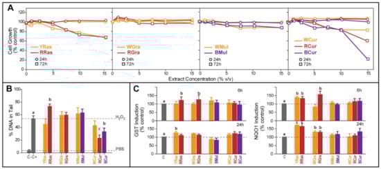The chemopreventive potential of water extracts from yellow (YRas) and red (RRas) raspberry, white (WGra) and red (RGra) grapes, white (WMul) and black (BMul) mulberry, and white (WCur), red (RCur), and black (BCur) currant varieties. (A) Influence on the growth of HT29 cells exposed to fruit extracts studied for two incubation periods (24 and 72 h). The results represent means of three independent determinations (SD did not exceed 5%). (B) The ability of tested water fruit extracts to protect DNA from oxidative damage assessed by comet assay. Negative control (C-)—cells not treated with genotoxic reagent; positive control (C+)—cells treated with 100 μM H2O2. The results represent means ± SD of three independent determinations. Significantly different values determined by one-way analysis of variance (ANOVA) with Dunnett’s post-test are marked as b p < 0.05, c p < 0.01. (C) The induction of phase II detoxification enzymes: glutathione transferases (GST) and quinone oxidoreductase (NQO1) in HT29 cells exposed to tested plant extracts (10% v/v in medium) for 6 h or 24 h. C—nontreated control cells. The results represent means ± standard deviation (SD) of three independent experiments. Significantly different values determined by one-way analysis of variance (ANOVA) with Dunnett’s post hoc test are marked as b p < 0.05, c p < 0.01.