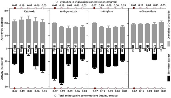 The results obtained in this study suggested that anthocyanins do not have a significant influence on tested biological activities with the exception of antioxidant activity, however, even in this case the outcome was not uniform. To verify the initial presumption that the content of pigment may impact biological properties of colored fruits, the influence of purified cyanidin-3-O-glucoside (Cy-3-O-Glu) solution on investigated biological activities (cytotoxic, antigenotoxic activity, and the ability to influence α-amylase and α-glucosidase activity) was studied. The applied concentrations of Cy-3-O-Glu solution reflected the total concentration of anthocyanins in appropriate colored plant samples. The obtained data on biological activities were compared with those obtained for crude plant extracts (Figure 5).