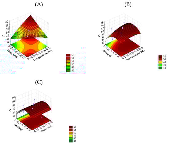 Response surface 3D contour plot indicating the effects of (A) temperature (T, °C) and time (t, min), (B) temperature (T, °C) and storage period (Sp, days), and (C) time (t, min) and storage period (Sp, days) on L* value of tomato fruit.
