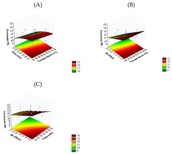 Response surface 3D contour plot indicating the effects of (A) temperature (T, °C) and time (t, min), (B) temperature (T, °C) and storage period (Sp, days), and (C) time (t, min) and storage period (Sp, days) on firmness (maximum force, N) of tomato fruit.