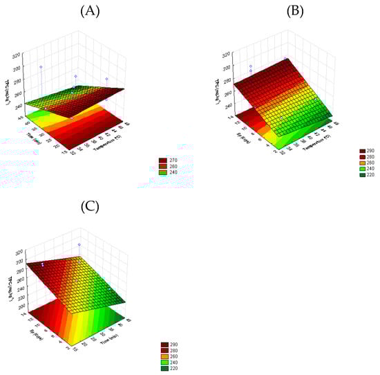 Response surface 3D contour plot indicating the effects of (A) temperature (T, °C) and time (t, min), (B) temperature (T, °C) and storage period (Sp, days), and (C) time (t, min) and storage period (Sp, days) on total phenolic content (TPC, mg Kg−1) of tomato fruit.